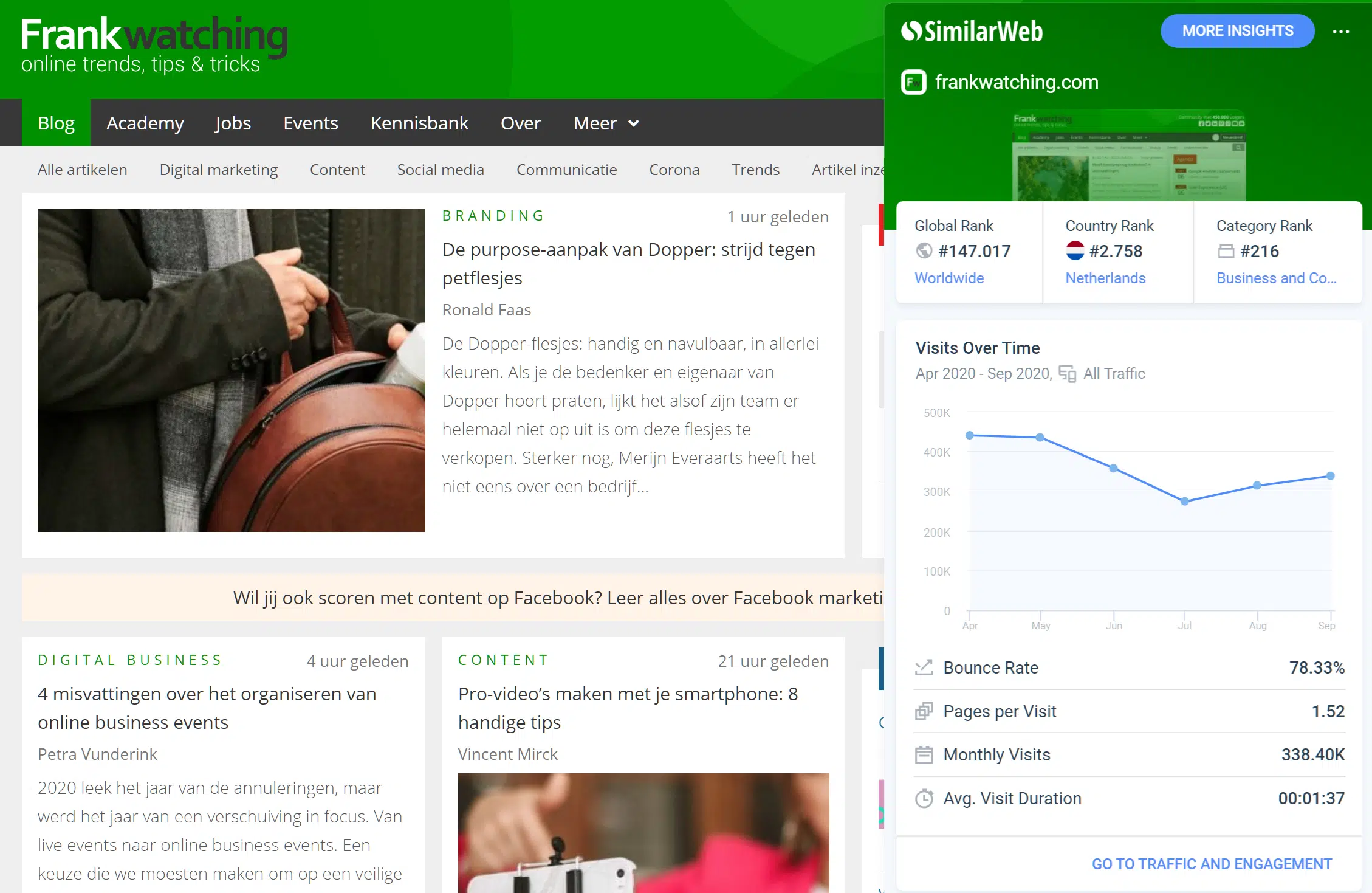 SimilarWeb zorgt voor een volledige website analyse. Zo kun je van websites zien wat hun wereldwijde ranking is, maar ook de ranking in de eigen categorie. Verder zie je de bezoekersaantallen en de top 5 landen waar de bezoekers vandaan komen.