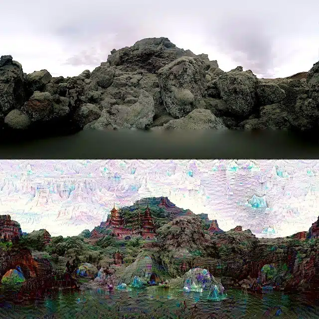 Op deze foto bijvoorbeeld hallucineerden de computer structuren en gebouwen op de top van een berg. De hallucinaties variëren afhankelijk van waar het neurale netwerk eerder aan werd blootgesteld, en er zijn honderden voorbeelden online waar de computer dieren, auto’s, mensenen gebouwen droomt. Sommige Deep Dreams zijn eigenlijk diepe nachtmerries die erg storend kunnen zijn.