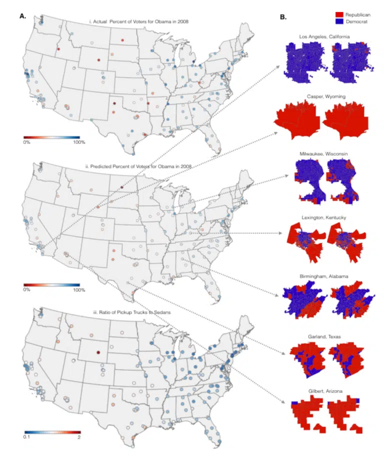 Demografische gegevens voorspeld door een Deep Learning netwerk na het bekijken van foto’s van auto’s in elke staat.