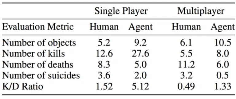 Statistieken van een Doom game, waarbij de computer in bijna elke parameter een ervaren menselijke speler verslaat.