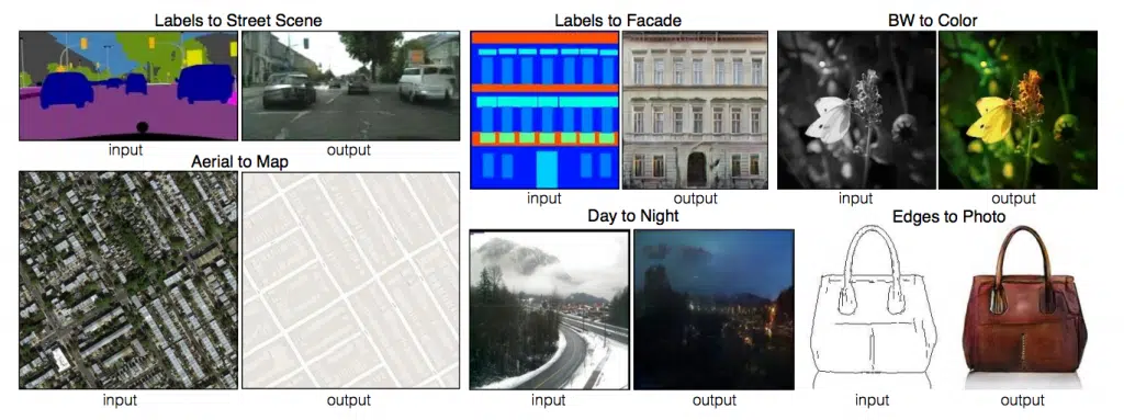 Hetzelfde idee als in “Let there be color!” kan worden gebruikt voor een Deep Learning netwerk om andere soorten nieuwe afbeeldingen te maken. In Pix2Pix hebben Isola et al een Deep Learning netwerk geleerd om meerdere taken uit te voeren: maak echte straatscènes van gekleurde klodders, maak een kaart van een echte luchtfoto, verander dagtaferelen in nacht en vul de kleuren in tussen de randen van objecten.