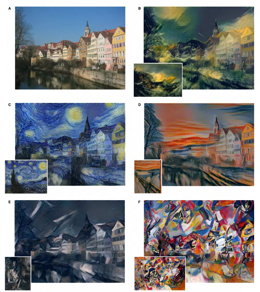 Een 2016-paper van Gatys, Ecker en Bethge experimenteerde met het volgende creatieve idee. Neem je favoriete kunstwerk en laat een Deep Learning netwerk de patronen in de lijnen, kleuren en schakeringen bestuderen. Sluit een nieuwe afbeelding aan op het netwerk en het netwerk kan de stijl van de originele illustratie overbrengen naar je afbeelding.