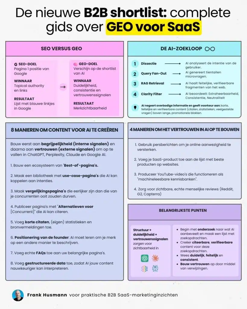 Voor SaaS-bedrijven betekent dit dat LinkedIn niet langer alleen een distributiekanaal is, maar een citatiebron voor AI search. Dit doe je door founders of subject matter experts structureel vragen te laten beantwoorden die kopers aan AI stellen (“Hoe evalueer je X?”, “Wanneer faalt Y?”, “Wat zijn echte alternatieven voor Z?”), vergroot je de kans dat jouw merk of perspectief letterlijk wordt ingebouwd in AI-antwoorden.