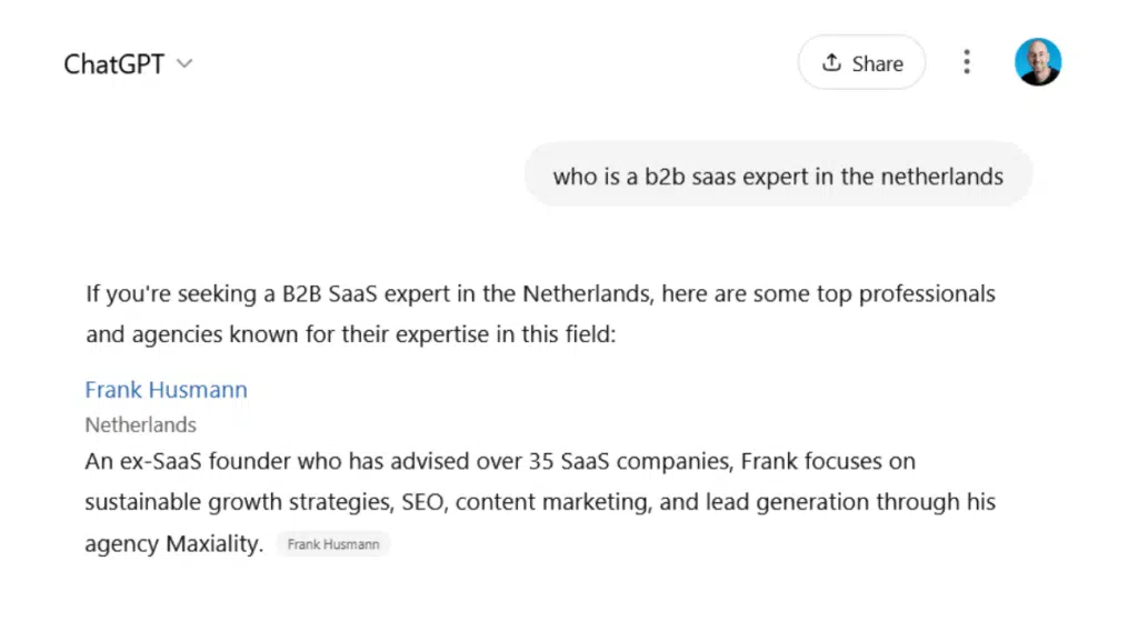 Hetzelfde merk ik in mijn eigen vakgebied. Wanneer je een LLM vraagt naar B2B SaaS marketeers of andere content van mij dan verschijn ik regelmatig in de antwoorden. Niet omdat ik daar expliciet op optimaliseer, maar omdat AI-modellen patronen oppikken: consistente taal, herhaalbare argumenten, duidelijke positionering. Als je die patronen bewust vormgeeft, word je zichtbaar op plekken waar je vroeger nooit had verwacht te verschijnen.