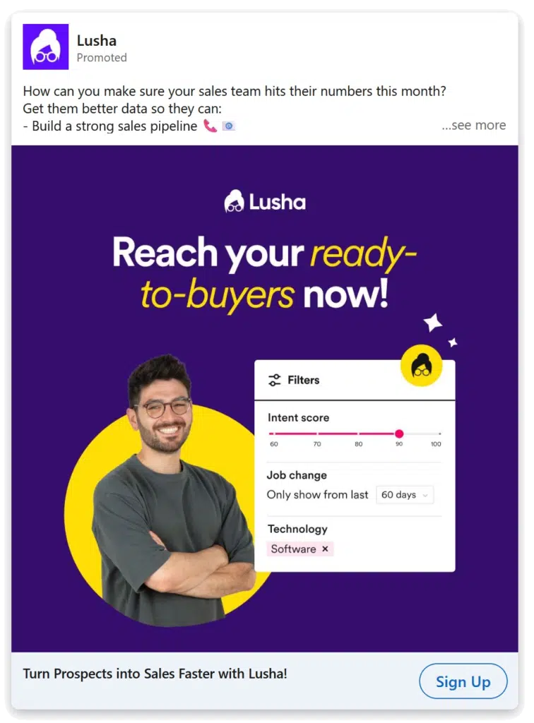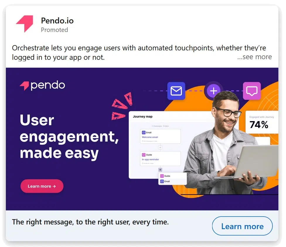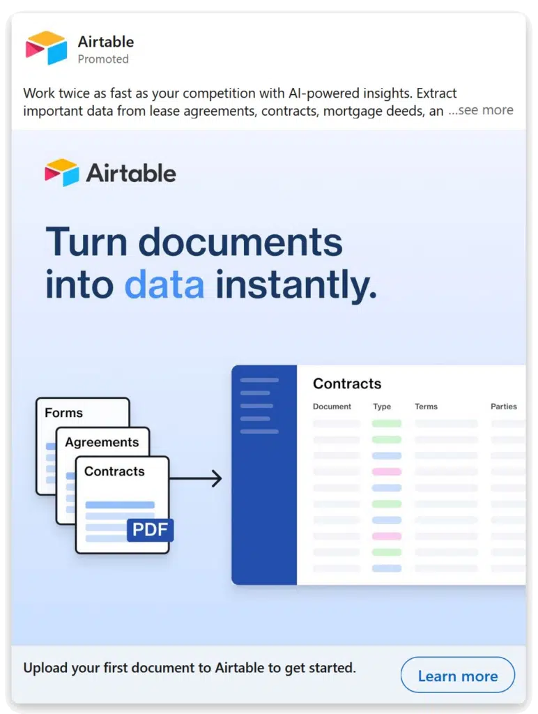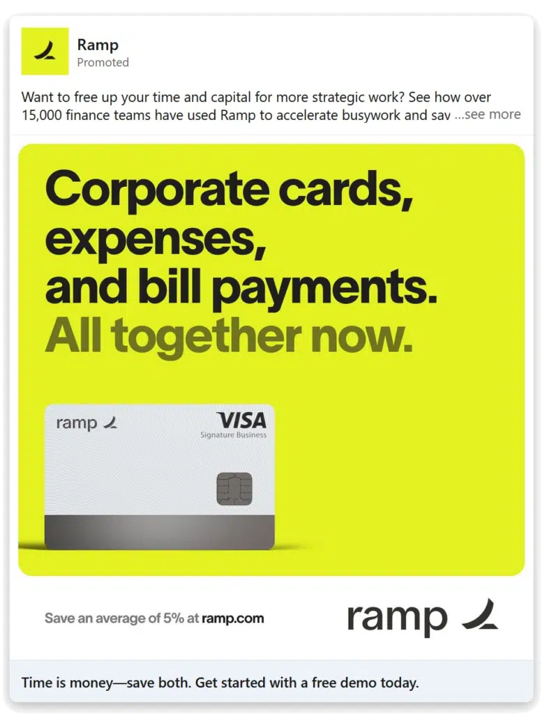 Deze LinkedIn advertenties van Airtable, Lusha, Ramp en Pendo geven mooi aan wat hun software doet in korte en krachtige taal. Dit zijn niet altijd de best presterende advertenties, maar noodzakelijk om te laten zien wat je SaaS precies doet.