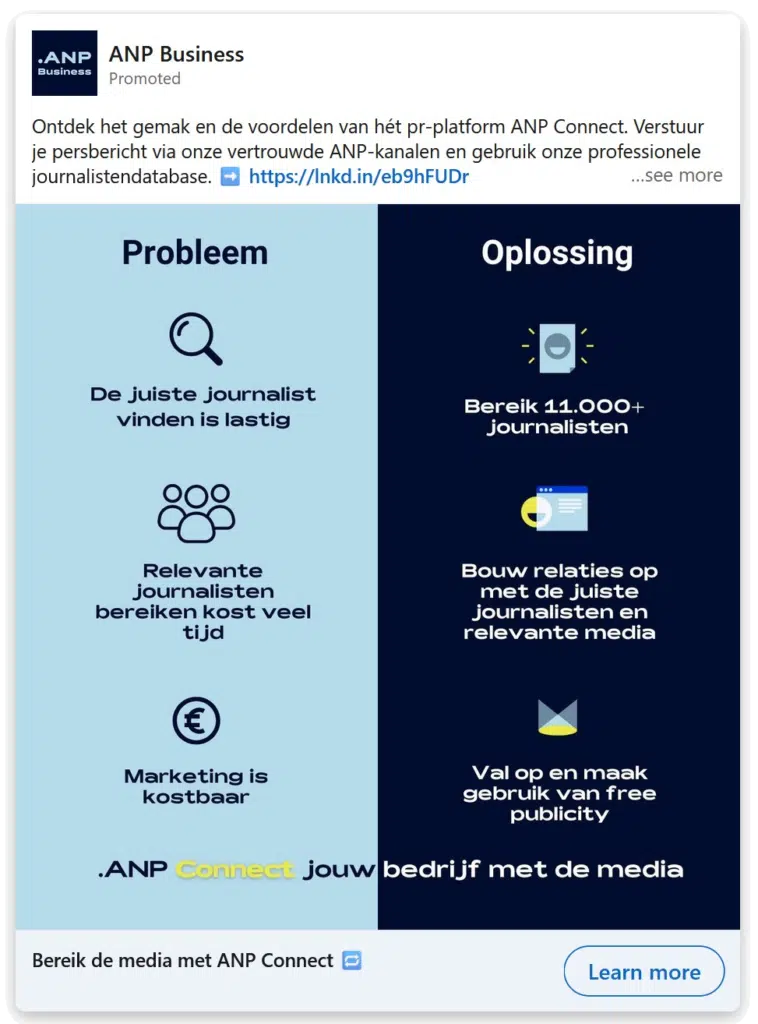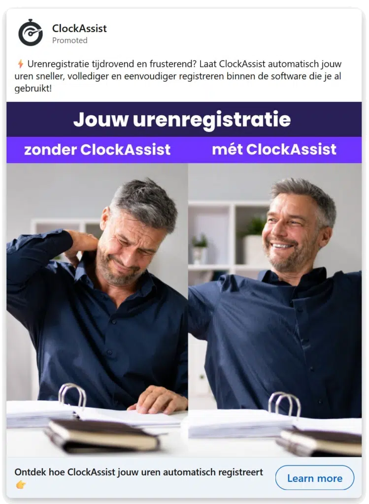 En rechts zie je een vergelijking op basis van het probleem en de oplossing. Het blijft mij bij elke campagne verbazen hoe goed dit soort advertenties presteren, een must have dus voor jouw SaaS LinkedIn campagnes!
