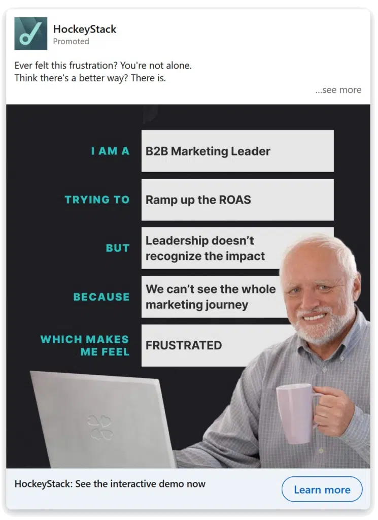 Als je jouw persona aanspreekt, bouw je een connectie op. Als je dan ook nog het probleem benoemt, begrijpt jouw doelgroep dat dit probleem oplosbaar is. En als je dan ook nog een meme gebruikt zoals HockeyStack, tover je wellicht ook nog een glimlach op het gezicht van de lezer.
