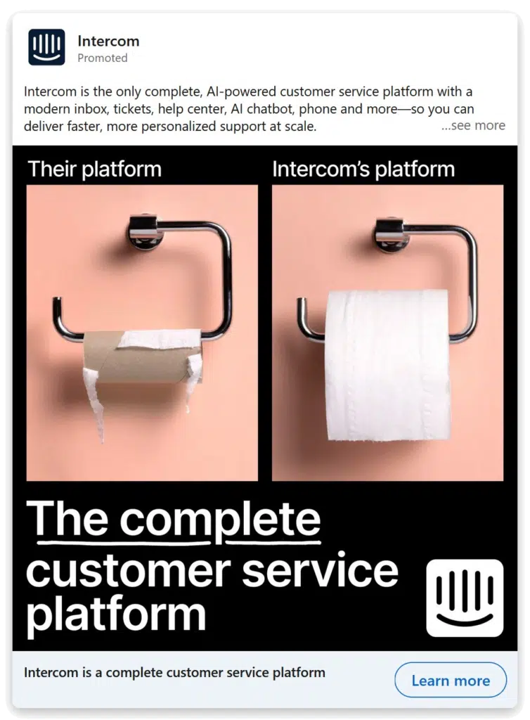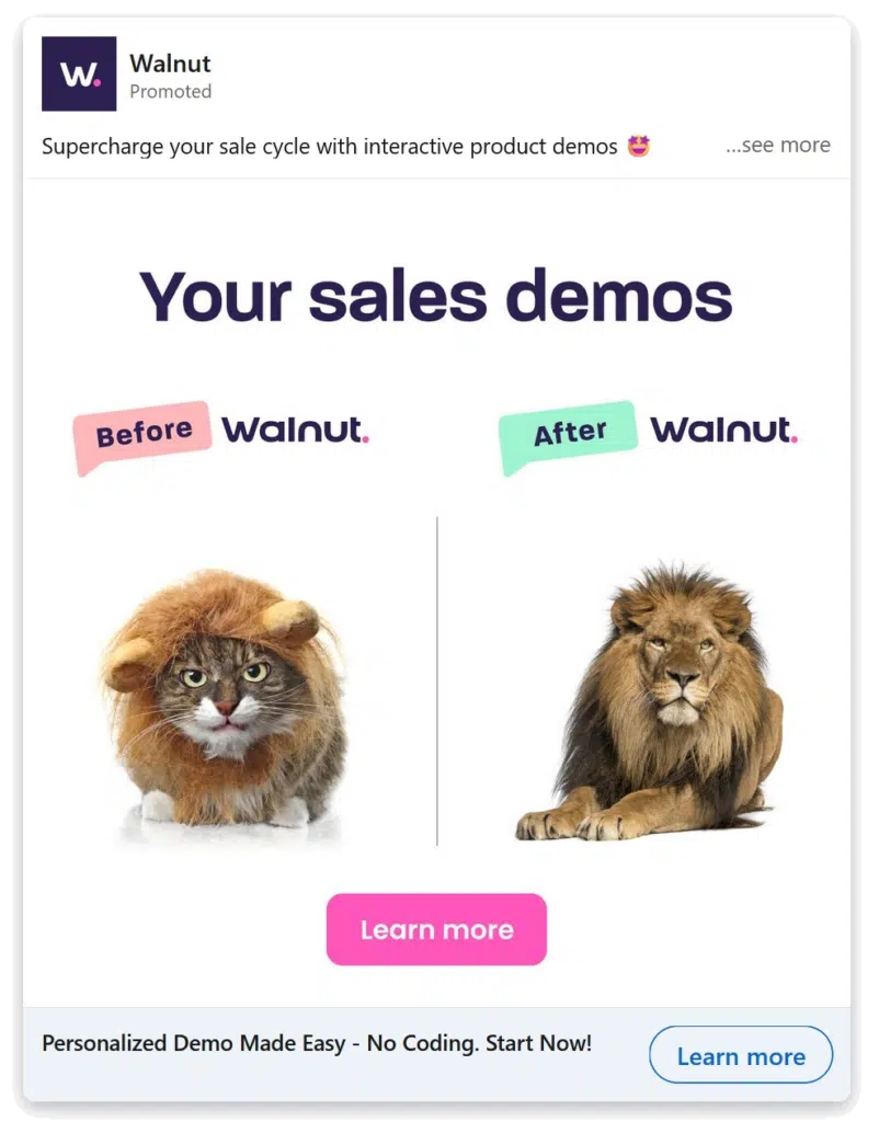 De vergelijking is in alle LinkedIn campagnes de best presterende advertentie voor een koude doelgroep. Je kunt een vergelijking maken op basis van een gevoel zoals bij Intercom. Of je kunt voor en na het gebruik van je SaaS tonen zoals bij Walnut. En dat ook nog met een vleugje humor!