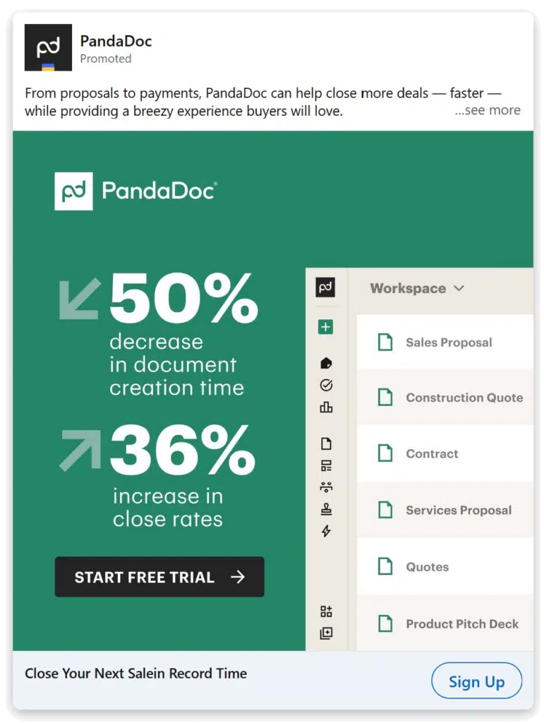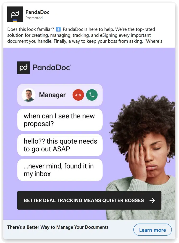 Een vraag stellen over een pijnpunt of juist het pijnpunt uitvergroten zoals in de advertentie van PandaDoc werkt altijd goed. Zo laat je zien dat er een probleem is en dat jouw SaaS dit kan oplossen.