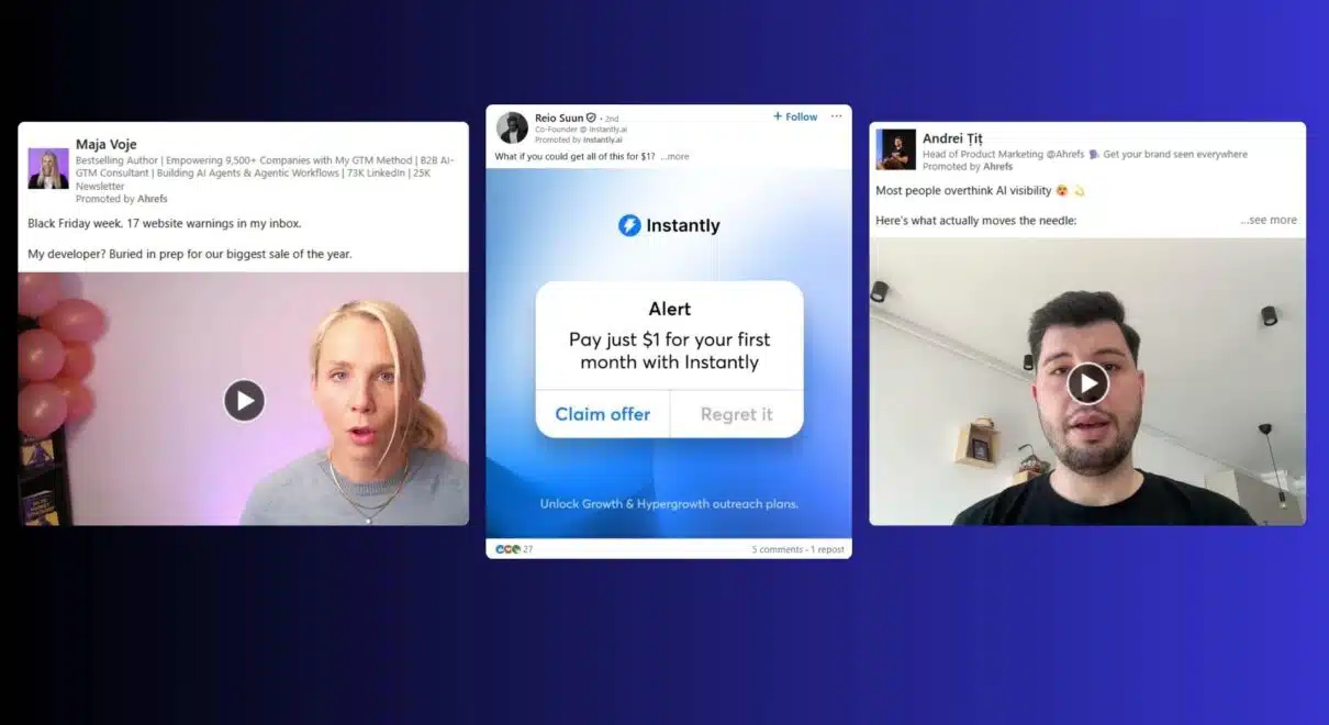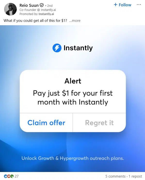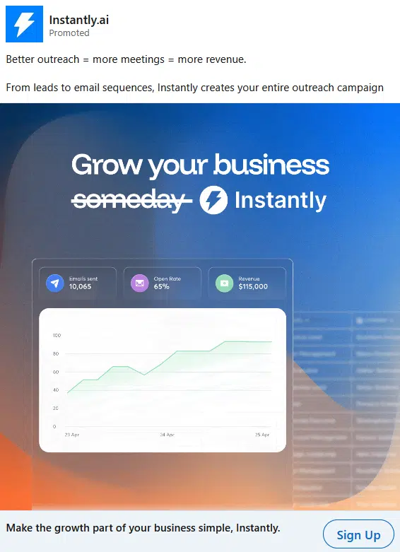 Traditionele advertenties komen van een bedrijfspagina en zien er vaak uit zoals… advertenties. Bedrijfskleuren, strakke visuals, campagnetaal. Hier is een voorbeeld van een traditionele LinkedIn-advertentie van een bedrijfspagina, ook van Instantly: