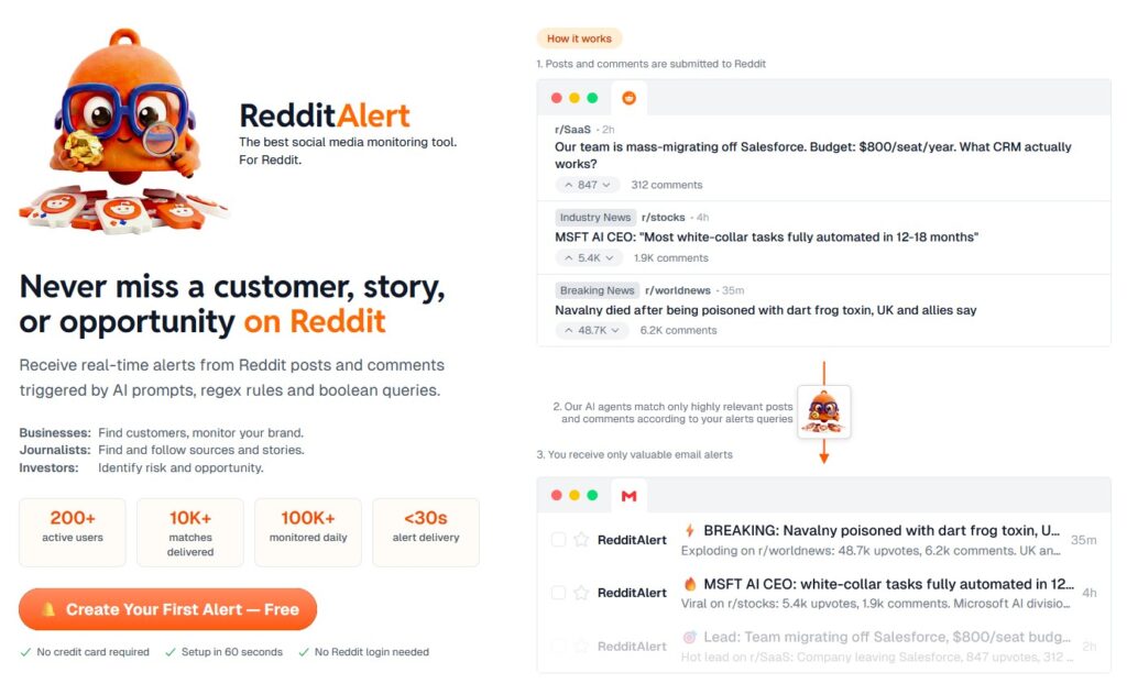 RedditAlert (gratis voor maximaal 3 meldingen, betaald vanaf $19/maand) is een betekenisvolle stap omhoog. Het gebruikt AI-gestuurde intentie-matching, je beschrijft wat je zoekt in gewone taal, geen exacte zoekwoordstrings. Meldingen komen binnen ongeveer 30 seconden na een match. Als je meer dan een handvol termen monitort en F5bot’s ruwe e-mailvolume ruis begint te worden, is RedditAlert de logische volgende tool.