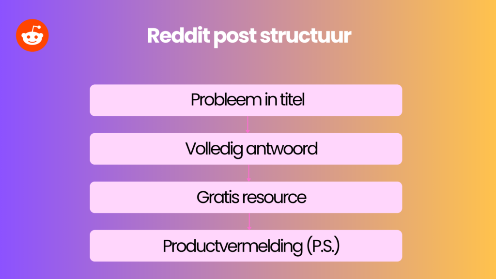 Reddit-gebruikers verzetten zich tegen verkopen, maar belonen actief generositeit. Als iemand echte waarde haalt uit je post voordat hij ooit je productnaam ziet, is zijn weerstand weg en landt de vermelding anders.