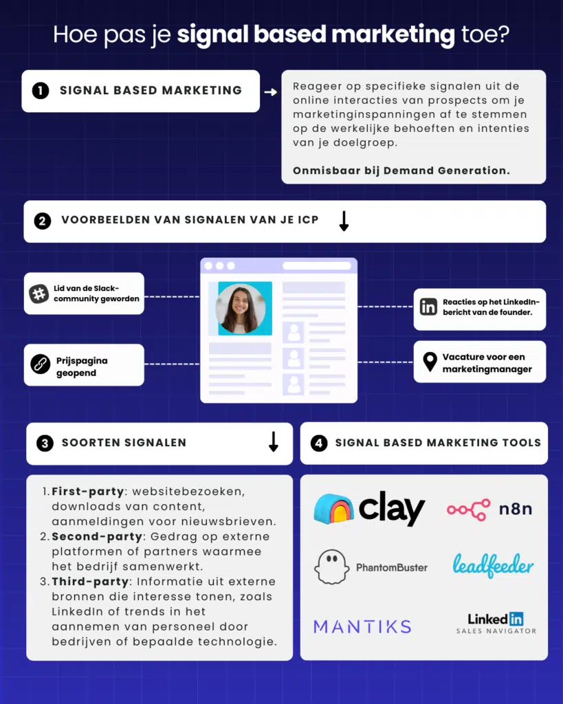 Deze signalen kunnen bijvoorbeeld websitebezoek, productgebruik, nieuwe hires, funding-rondes of engagement met content zijn. Door deze signalen te monitoren kunnen marketing- en salesteams precies inspelen op de behoeften van potentiële klanten.