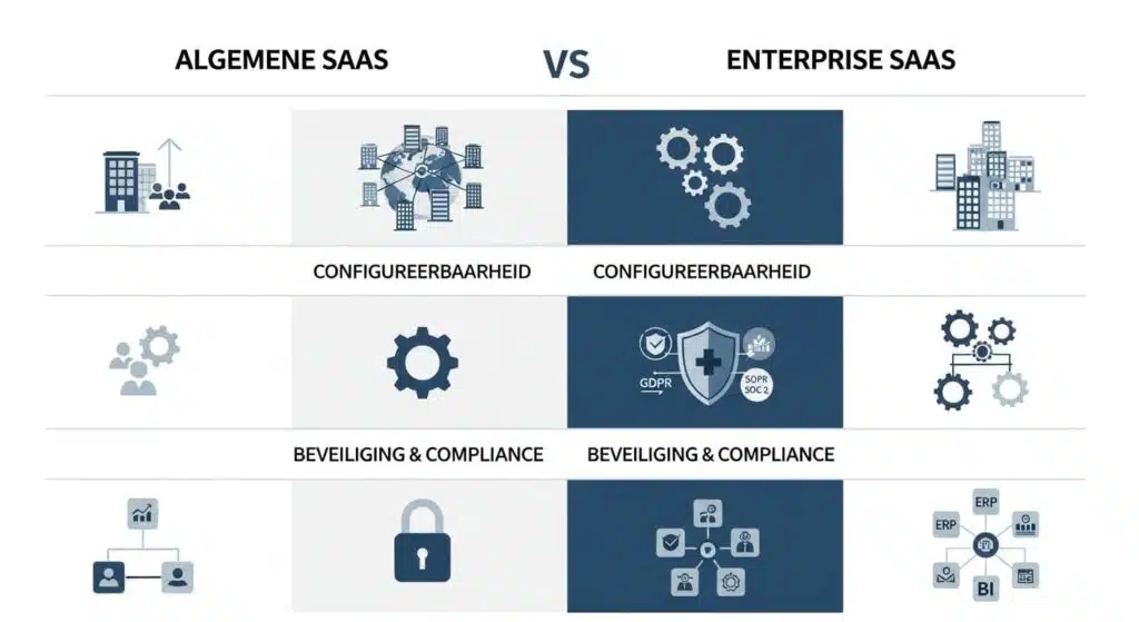 Enterprise SaaS voldoet aan strikte normen zoals GDPR, SOC 2, ISO 27001 en HIPAA. Je krijgt uitgebreide beveiligingsopties, versleuteling, audit-logs en toegangsbeheer.