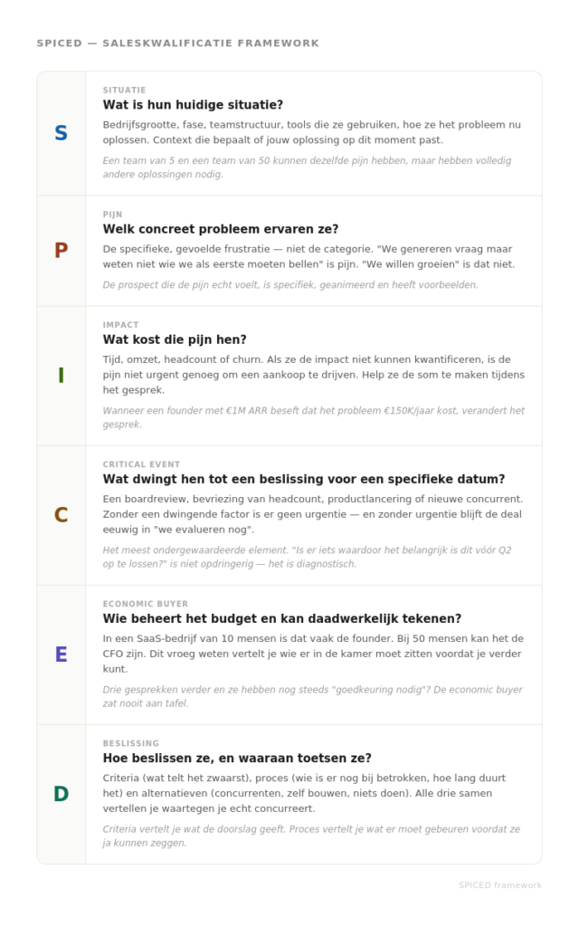 Dit is het meest onderbenutte element van SPICED. Founders aarzelen hier vaak om door te vragen, omdat het aanvoelt als druk zetten. Maar de vraag “is er iets waardoor het oplossen van dit vóór Q2 extra belangrijk is?” is niet opdringerig. Het is de vraag die een echte deal onderscheidt van een beleefd gesprek.